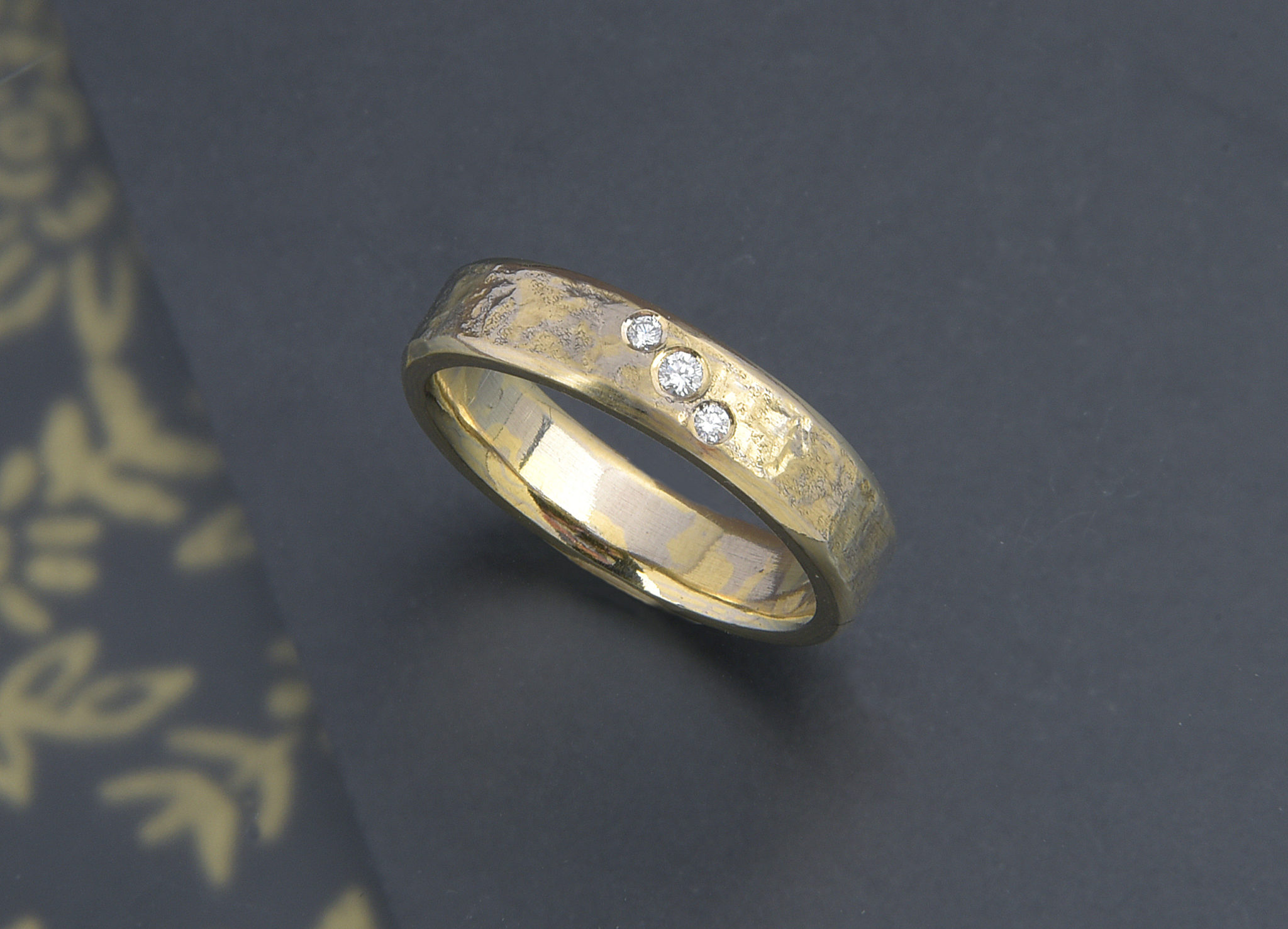 Mokume Gane Ring feiner Eisschlag mit drei Brillanten in Gelbgold 917 und Palladiumweißgold 585. Brillant 2 mm Mittig 0,03 ct. zwei Brillanten seitlich 1,5 mm 0,03 ct.